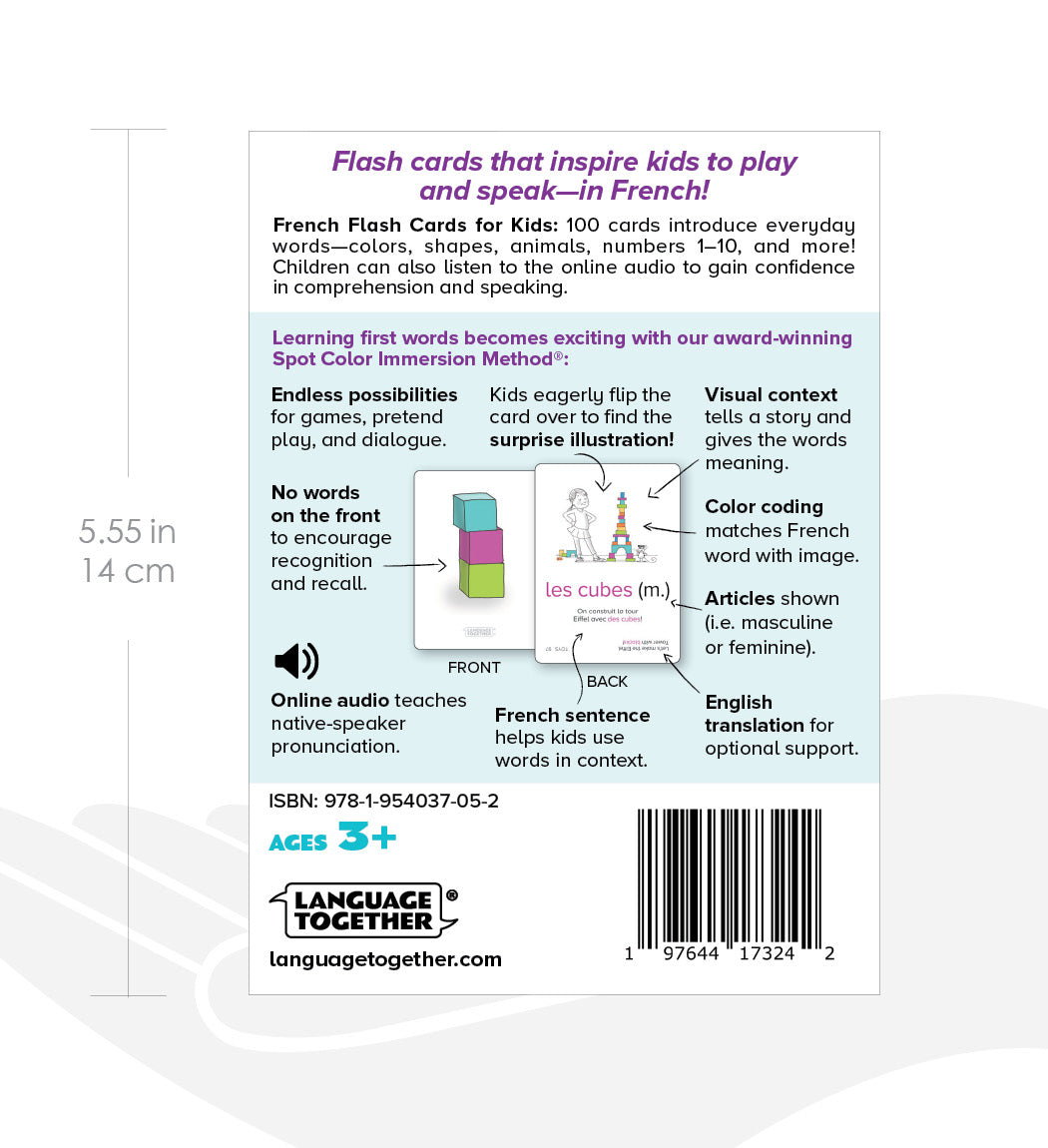 - Picture only fronts of flash cards encourage recognition and recall. Kids eagerly flip the card over to find the surprise illustration, the French word and example sentence.